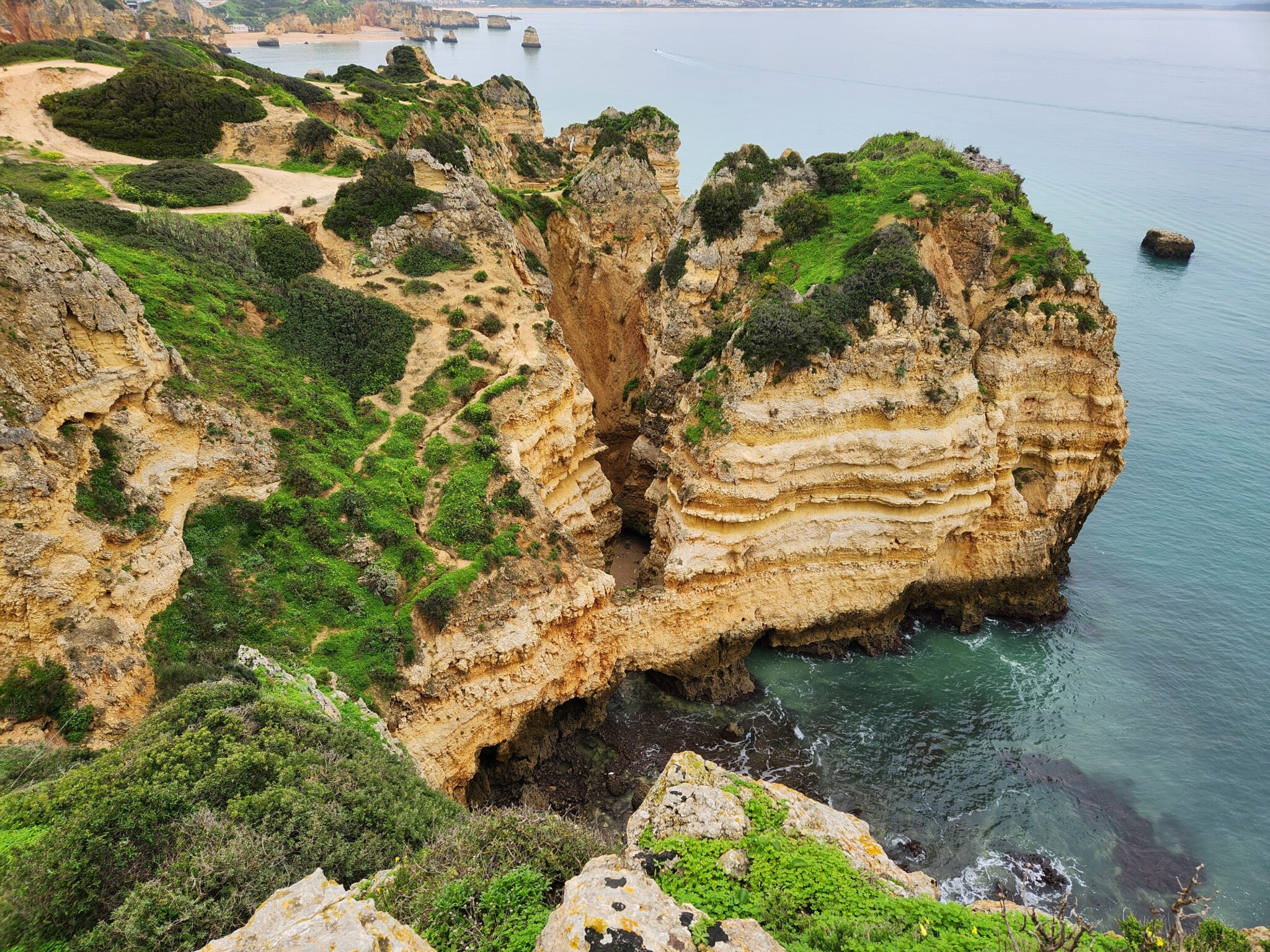 The clifs of Lagos were unlike anything ive ever seen in my entire life. Sheer and crumbling yellow limestone and deep red sandstone. each crack and nook, each flat area, was alive with bright verdant vegitation. And beneath it all, waves of viberant teal smash against the stones, wetting and carving the rocks away until all that is left are sovweing pillars that seem to defy logic.
